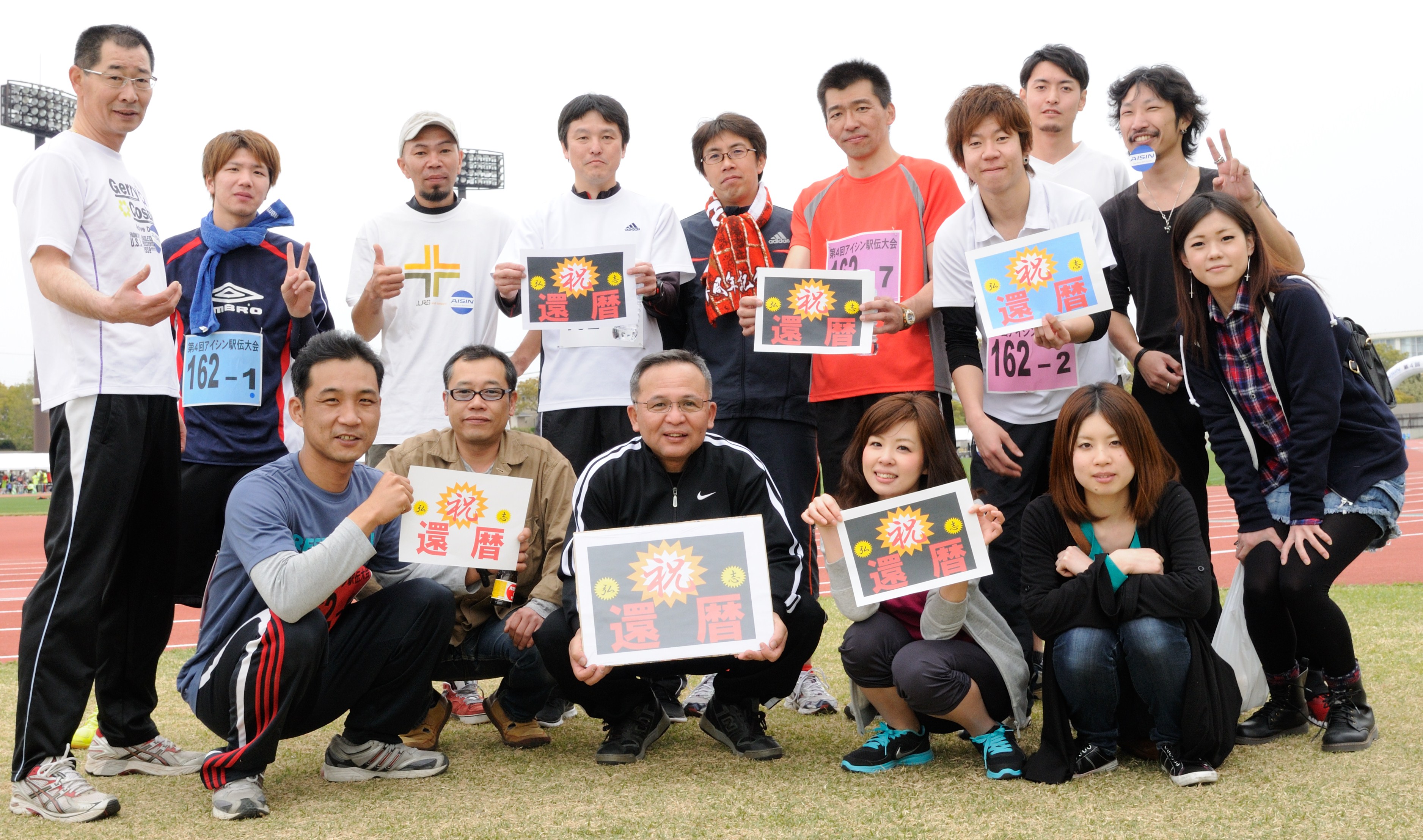 最前列の真ん中の黒いジャージを着ている人が上司で還暦のプラカード